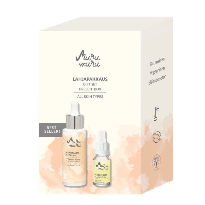 Lahjapakkaus sisältää C-vitamiiniseerumin 30 ml ja Anti-Stress Kasvoöljyn 10 ml.